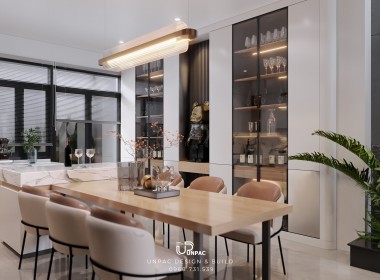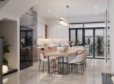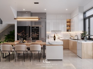 Khu Bếp: Tông màu sáng chủ đạo được sử dụng trong khu vực bếp với tủ bếp màu trắng, mặt bếp bằng đá tự nhiên sáng màu tạo nên sự sạch sẽ và thoáng đãng. Bàn ăn đơn giản, ghế ăn được bọc nỉ tông màu trung tính, giúp bếp trở thành không gian ấm cúng và gần gũi.