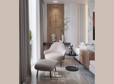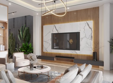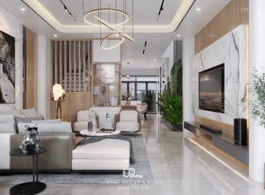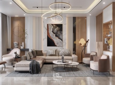 Phòng Khách: Sử dụng tông màu trầm sáng với ghế sofa màu nâu nhạt kết hợp bàn trà bằng gỗ tự nhiên giúp không gian trở nên ấm áp. Đèn trần hiện đại với ánh sáng dịu nhẹ tạo nên điểm nhấn nổi bật cho căn phòng.