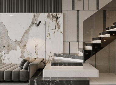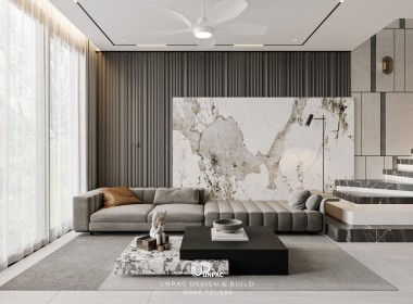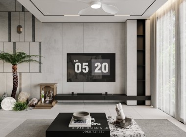 Phòng khách là nơi đón tiếp khách và sinh hoạt chung của cả gia đình, vì vậy thiết kế không gian này được UNPAC chú trọng đến từng chi tiết. Tone màu xám betong được lựa chọn làm màu chủ đạo, tạo cảm giác hiện đại, mạnh mẽ nhưng không kém phần sang trọng. Tường và sàn được ốp vật liệu có họa tiết betong tinh tế, kết hợp với nội thất tối giản mang đến sự hài hòa. Sofa và bàn trà với kiểu dáng đơn giản, gam màu trung tính, hoàn toàn ăn khớp với tổng thể không gian phòng khách.