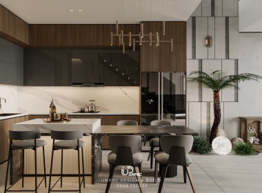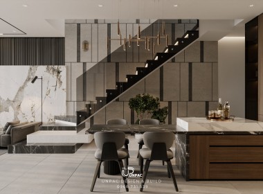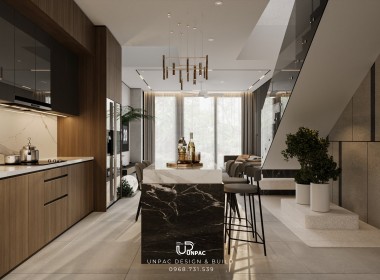 Thiết kế phòng khách thông với phòng bếp giúp không gian trở nên rộng rãi và thuận tiện hơn cho việc di chuyển. UNPAC đã khéo léo tạo ra sự phân cách nhẹ nhàng giữa hai khu vực bằng cách sử dụng tủ kệ hoặc vách ngăn hở, không làm gián đoạn tầm nhìn mà vẫn giữ được sự tách biệt cần thiết. Thiết kế liên kết này tạo nên sự gắn kết trong sinh hoạt gia đình, mang lại cảm giác thông thoáng và hiện đại.
