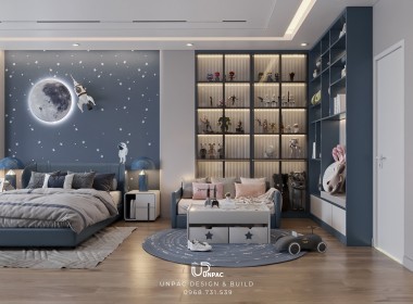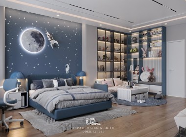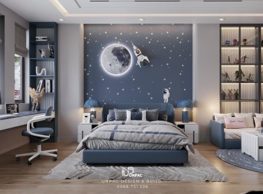 Phòng ngủ bé trai với tone màu xanh dương và xám trắng kết hợp tranh vẽ phi hành gia không chỉ mang lại không gian năng động, sáng tạo mà còn đảm bảo sự an toàn và tiện dụng. Với sự chuyên nghiệp và sáng tạo, Công ty Thiết Kế Nội Thất UNPAC tại Bình Dương luôn là lựa chọn hàng đầu cho các gia đình khi muốn thiết kế và thi công nội thất cho phòng ngủ trẻ em.