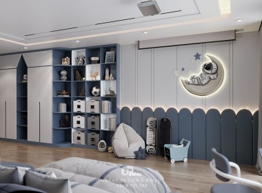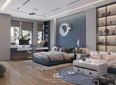 Thiết kế phòng ngủ cho bé trai không chỉ đòi hỏi sự sáng tạo trong cách phối màu mà còn cần tính an toàn và tiện dụng. Với sự kết hợp giữa tone màu xanh dương, xám trắng và các chi tiết trang trí như tranh vẽ phi hành gia, Công ty Thiết Kế Nội Thất UNPAC mang đến một không gian đầy cảm hứng và thoải mái cho bé. Đây là một trong những dự án thiết kế nội thất nổi bật tại Bình Dương, giúp trẻ phát triển trí tưởng tượng và có một không gian nghỉ ngơi tiện nghi, an toàn.